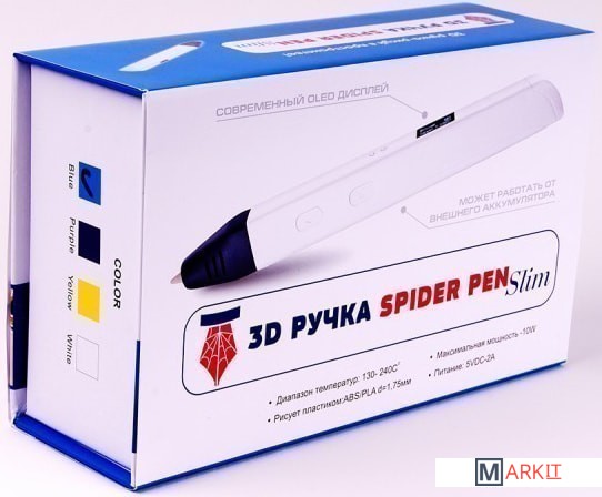 Комплектация - 3D ручка Spider Pen SLIM с OLED дисплеем;- Блок питания;- USB-кабель;- Демо-комлект пластика 10 метров;- отвертка для регулировки температуры;- Инструкция на русском языке;- Книга трафаретов.