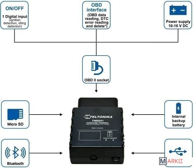 FMB001 — это передовой терминал для отслеживания транспортного средства в режиме реального времени с поддержкой GNSS, GSM и Bluetooth® связи, который может собирать координаты и другие полезные данные, включая данные бортового компьютера и передавать их через сеть GSM на сервер. Это устройство идеально подходит для приложений, использующих данные о местонахождении удаленных объектов и может применяться в: управлении автопарком, компаниях по аренде автомобилей, службах такси, а также в личных автомобилях и т. д.. FMB001 подключается непосредственно к OBDII разъему автомобиля для считывания параметров бортового компьютера.