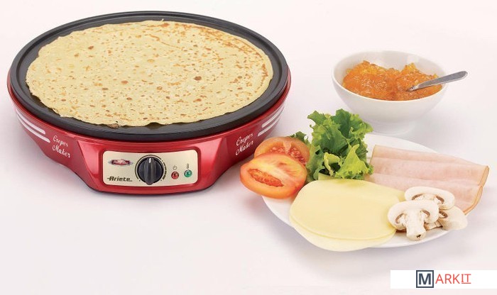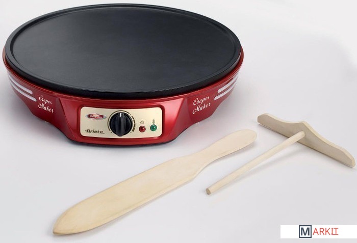 Дизайн блинницы, как и всех устройств из серии Party Time, выполнен в стилистике 50-х готов прошлого века.Форма прибора и антипригарное покрытие позволяют с легкостью испечь идеально поджаренные, румяные, ровные и тонкие блинчики. Не потребуется даже использовать масло.Управление прибором – несложное и удобное: на передней панели расположены световые индикаторы и регулятор уровня нагреваПриготовьте заранее жидкое тесто для блинчиков. После включения прибора в сеть, задайте при помощи регулятора нужную температуру нагрева (от 125° до 180°) и следите за зеленым индикатором. Как только он отключился - блинница готова к работе. Порцию теста аккуратно налейте на разогретую поверхность. Специальным шпателем разровняйте тесто ровным слоем по всей жарящей поверхности.В комплекте, помимо специального деревянного шпателя для разравнивания теста, поставляются деревянная лопатка для деликатного переворачивания и снятия готового блинчика. А также буклет с рецептами блюд, которые вы сможете приготовить с блинницей 183 Crepes Maker.
