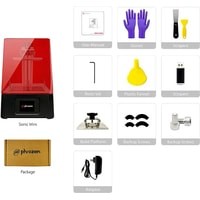 Комплектация 3D принтер;Перчатки;USB-флешка;Пластиковый шпатель;Металлический шпатель;Воронка;Шестигранник;Запасные винты;Кабель питания;Инструкция;Печатная платформа;Ванна для смолы;Запасные ножки.