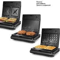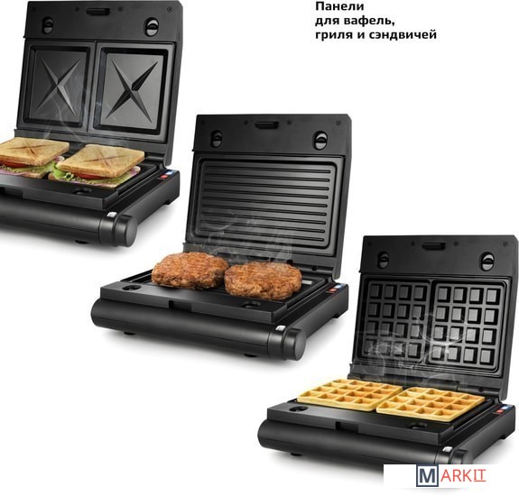 | Комплектация | ГрильСменные панели:- для гриля (установлены в устройство) - 2 шт- для сэндвичей - 2 шт- для вафель - 2 штРуководство по эксплуатации |