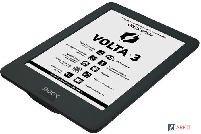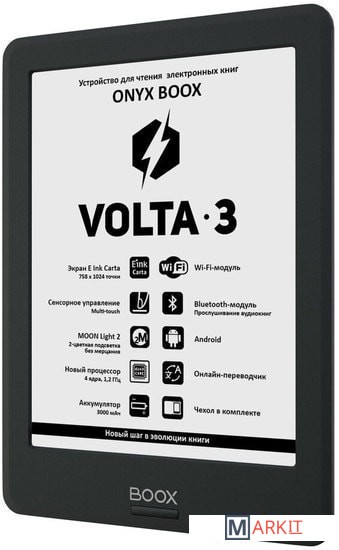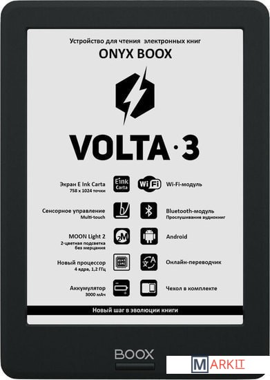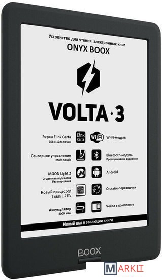 ONYX BOOX Volta 3 — устройство для чтения электронных книг с экраном типа «электронная бумага» E Ink Carta размером 6 дюймов. Модель имеет встроенную подсветку MOON Light 2 c возможностью регулировки цветового оттенка и отсутствием мерцания. Модуль Wi-Fi и сенсорное управление в сочетании с полноценным браузером позволяют с комфортом использовать устройство для серфинга в сети Интернет. Встроенный модуль Bluetooth даёт возможность слушать музыку и аудиокниги с помощью беспроводных наушников или колонки. А предустановленное программное обеспечение содержит многочисленные настройки текста, тап-зон и жестов для комфортного управления. Кроме того, благодаря операционной системе Android, вы сможете устанавливать сторонние программы для чтения. Устройство выполнено в компактном эргономичном корпусе и поставляется в комплекте с чехлом с функцией SIDE control.