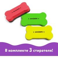Стиратели магнитные ЮНЛАНДИЯ предназначены для стирания сухим способом надписей, сделанных маркером, с белых досок.Встроенный магнит позволяет расположить стиратель в любом месте рабочей поверхности доски. Стиратель имеет эргономичную форму и необычный яркий дизайн. Размер — 55х110 мм. Стирающий слой выполнен из фетра. Поставляется в упаковке с европодвесом. В комплекте 3 стирателя: красного, желтого и зеленого цвета. Внимание: стирать надписи с доски рекомендуется лёгкими круговыми движениями.