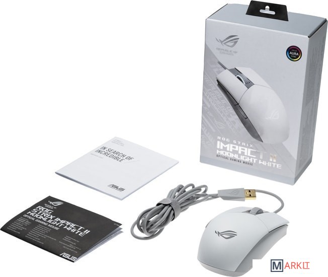 ROG Strix Impact II Moonlight White – это игровая мышь с легким симметричным корпусом, которая отличается высокой чувствительностью за счет сенсора с разрешением 6200 точек на дюйм. С помощью специальной кнопки ее чувствительность моментально изменяется между четырьмя заданными уровнями. Основные кнопки используют шарнирный механизм для уменьшения глубины хода. Их переключатели можно заменить, чтобы продлить срок службы устройства. Изготовленный из мягкой резины кабель не препятствует плавному скольжению мыши по столу.Команда разработчиков ASUS привлекла к созданию мыши ROG Strix Impact II Moonlight White профессиональных киберспортсменов, поэтому ее симметричный корпус, одинаково хорошо подходящий и для правшей, и для левшей, отличается продуманной эргономикой. Вес устройства – всего 79 г. Сенсор чувствительностью до 6200 точек на дюйм способен отслеживать перемещения со скоростью до 220 дюймов в секунду. Частота опроса в 1000 Гц гарантирует максимально быстрый отклик устройства. Мышь обладает пятью кнопками, которые можно запрограммировать по своему вкусу.Чем меньше ход клавиши, тем быстрее она срабатывает, поэтому в основных кнопках мыши ROG Strix Impact II Moonlight White используется специальный механизм: металлические шарниры и пружины балансируют кнопки и минимизируют расстояние от них до переключателей. Результат – короткий ход и быстрый возврат кнопок, что обеспечивает их четкое и стабильное срабатывание при каждом нажатии.Выбирайте среди бесчисленного множества цветовых оттенков и нескольких динамических визуальных эффектов, а также синхронизируйте ее работу с подсветкой других Aura-совместимых устройств (технология Aura Sync). Заданные настройки можно сохранить в виде трех профилей в памяти самого устройства, чтобы затем использовать их при подключении к разным компьютерам.