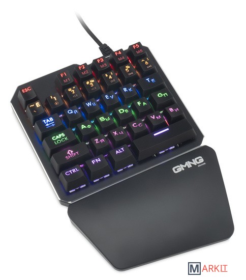 Механический игровой блок, с поддержкой запястья, прорезиненные ножки, коричневые свичи с ресурсом 50 млн кликов, поддержка макросов, регулируемая подсветка, плетеный кабель, ферритовый фильтр, позолоченный коннектор USB, металлическая верхняя панель.