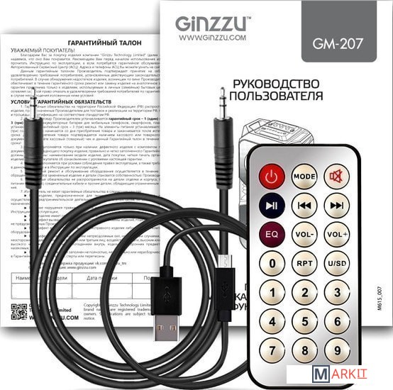 - пульт ДУ- аудиокабель 3.5 мм- кабель для зарядки- документация |