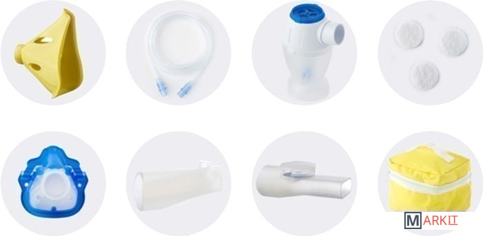 Комплект поставки - Детская маска- Взрослая маска- Ротовой мундштук- Насадка для носа- Распылитель- Запасные фильтры- Сумка