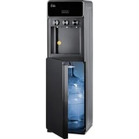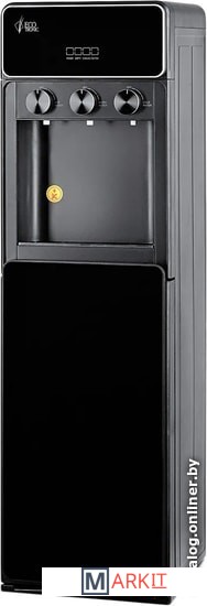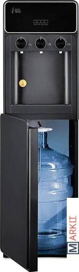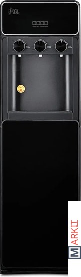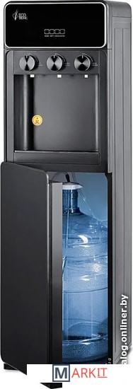 Напольный кулер с нижней загрузкой бутыли и поворотными кранами подачи воды. Необычный внешний вид кранов, стильный корпус полностью черного цвета и нижний отсек, в котором полностью скрывается бутыль, позволяют эффектно вписать этот кулер в современный интерьер с продуманным дизайном.Модель с электронным охлаждением, со стандартной производительностью. Есть индикация работы аппарата, нагрева, охлаждения и необходимости заменить бутыль. Три крана подачи воды: горячей, холодной и комнатной температуры. Для подачи воды нужно повернуть соответствующий кран, для остановки подачи — вернуть его в исходное положение.