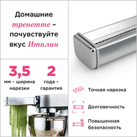 Ваша кухонная машина станет для вас надежной и верной помощницей не только в обработке продуктов, но и также может помочь вам приготовить аппетитную домашнюю пасту из натуральных свежайших ингредиентов. Насадка Kenwood KAX983 для пасты Trenette создана производителем из высококачественной нержавеющей стали, с ее помощью можно готовить пасту Тренетте. Это классическая паста Италии, одна из разновидностей тонкой лапши из разнообразных твердых сортов пшеницы, при ее приготовлении не используются яйца, а используется только вода и мука. Отсутствие в составе теста яиц дает возможность почувствовать легкий изысканный ореховый привкус пшеницы, из которой сделана мука. Чтобы приготовить данную пасту, для начала замесите и раскатайте на тонкий пласт тесто при помощи вашей кухонной машины Kenwood, а затем присоедините эту насадку к низкоскоростному гнезду, чтобы нарезать Тренетте тонкими полосками. Ширина этого вида пасты составляет всего 3.5 мм. Насадка подходит к кухонным машинам Chef Sense. Обратите внимание! Чистить насадку можно только влажной тряпкой. Не опускайте в воду и не мойте никакие части аксессуара в посудомоечной машине.