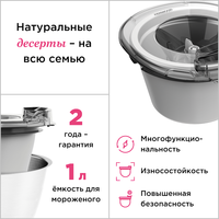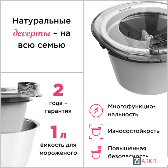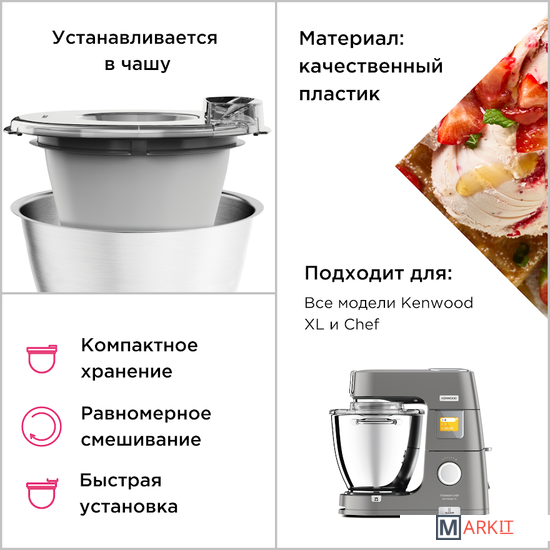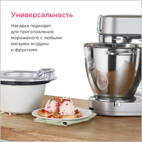 Насадка может удобно расположиться внутри чаши вашего Kenwood Chef и укомплектована всем необходимым, включая чашу для предварительного замораживания, лопатку для смешивания и переходник для чаши.