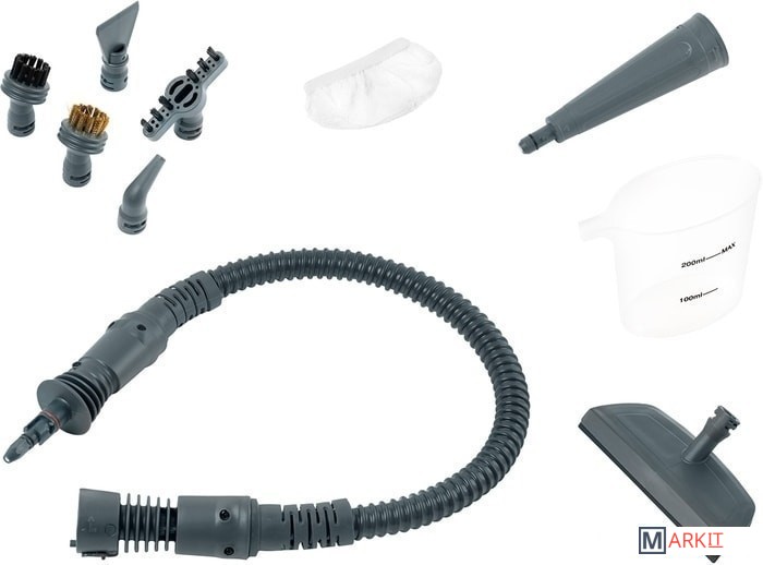 Дополнительные насадки и приспособления - угловая насадка;- круглая латунная щетка;- круглая и плоская ворсовые щетки;- скребок;- мерный стакан. / угловая насадка, круглая латунная щетка, круглая и плоская ворсовые щетки, скребок, мерный стакан