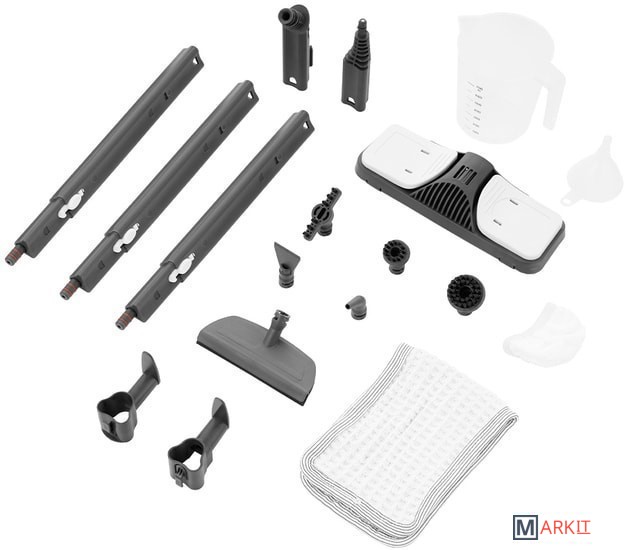 Дополнительные насадки и приспособления мерный стакан, воронка, скребок, угловая насадка, тряпка для пола, тряпка для отпаривания