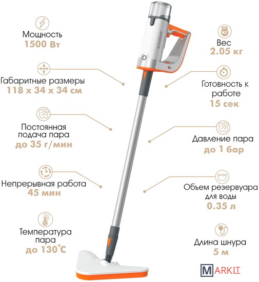 Уже не для кого не новость, что пар – это лучший помощник в борьбе с удалением грязи в доме. И обычная паровая швабра уже не актуальна, поскольку ей можно очистить только пол. А что делать со стенами, окнами, зеркалами и прочими местами, от куда тоже нужно удалить грязь и очистить без помощи бытовой химии?Представляем Вашему вниманию паровую швабру «2 в 1» ENDEVER ODYSSEY Q-621. Данная модель позволяет помимо классической паровой швабры, еще использовать ее, как ручной универсальный отпариватель, расширяя возможности по уборке и дезинфекции различных типов поверхностей, а не только пола. Дополнительный комплект из 4-х насадок поможет добраться до самых труднодоступных мест в Вашем доме.Хорошие показатели мощности 1500 Вт позволяют паровой швабре ENDEVER ODYSSEY Q-621 получить значение подачи пара до 35 г/мин. 2 уровня подачи пара, время непрерывной работы до 45 мин, температура пара до 130 градусов, объем бака 0,35 л., готовность к работе до 15 секунд. Всё это делает эту модель лидеров в своем классе.Длина сетевого шнура составляет 5 метров, что вполне будет достаточно для комфортного перемещения при уборке в Вашем доме. За безопасность отвечают функции защиты от протечки воды и перегрева. Расширенная гарантия 18 месяцев дополнительно защитит Вас от непредвиденных ситуаций при эксплуатации паровой швабры ENDEVER ODYSSEY Q-621.