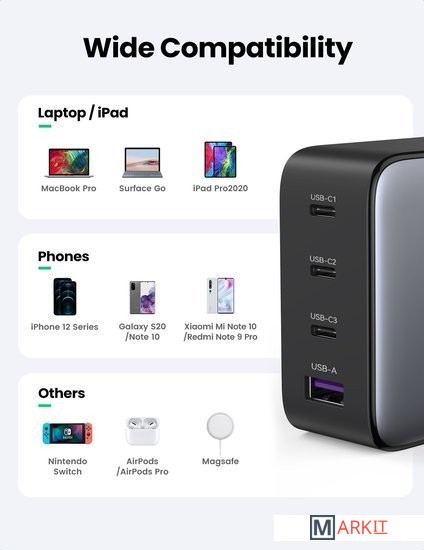 Выходная мощность 100 Вт3 порта USB C и 1 порт USB A для зарядкиНовейшая технология GaN для быстрой и безопасной зарядкиUSB C Port:PD3.0(PD2.0) /QC4+(QC4.0QC3.0QC2.0)/PPS /AFC/APPLE 5V2.4A/BC1.2USB A Port:SCP/QC3.0/AFC/FCP/APPLE 5V2.4A/BC1.2