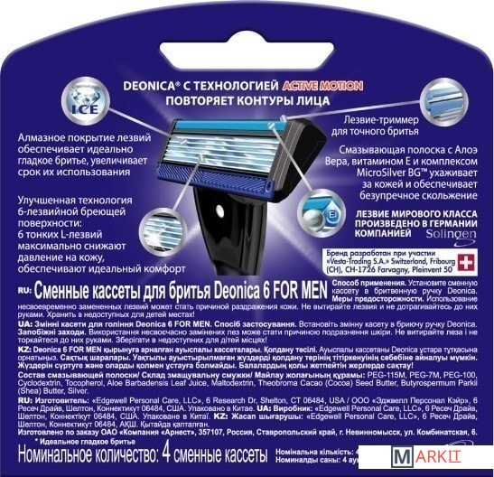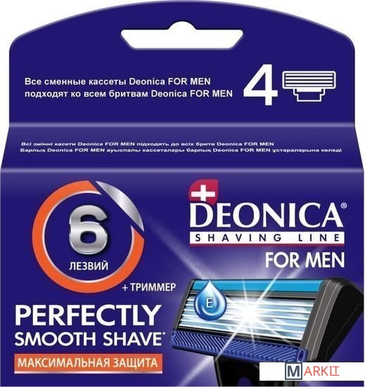 Улучшенная технология 6-лезвийной бреющей поверхности максимально снижает давление на вашу кожу и обеспечивает идеальный комфорт при бритье. 6 тонких L-лезвий мирового класса произведены в ГерманииАлмазное покрытие лезвий обеспечивает идеально гладкое бритье и увеличивает срок их использования. Смазывающая полоска с Алоэ Вера, витамином Е и антибактериальным комплексом MicroSilver обеспечивает безупречное скольжение и уменьшает дискомфорт во время бритьяДля подравнивания усов и бороды можно воспользоваться специальным лезвием-триммером, которым оснащены сменные кассеты DeonicaЛюбые сменные кассеты Deonica: на 3, 5 или 6 лезвий – можно использовать с любой бритвенной системой DeonicaГладкое и комфортное бритье без раздражений даже на самой чувствительной коже