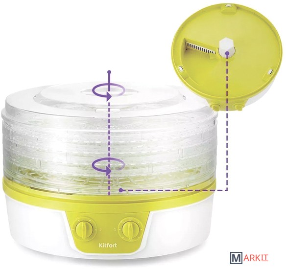 Насушит на всю зиму!С сушилкой для фруктов и овощей с вращающимися поддонами KT-1935 у вас под рукой будет всегда живая еда. Прибор насушит на всю зиму помидоры, кабачки, баклажаны, клубнику, абрикосы, персики, тыкву, грибы, зелень, хлеб и многое другое.1 поддон для вращения и 4 поддона в комплектеПоддон для вращения устанавливается на вал сушилки, остальные ставятся на него. Благодаря этому, а также мощному нагревательному элементу и вентилятору, происходит равномерное распределение нагретого воздуха по всему объёму камеры.Безопасная сушка любимых продуктовВсе поддоны изготовлены из пластика, безопасного для здоровья - он не содержит Бисфенол А (BRA free). Они прозрачные, поэтому вы легко можете наблюдать за процессом сушки.Сушите продукты любой толщины!Благодаря съёмному дну поддонов вы можете готовить продукты, которые не вмещаются по высоте между поддонами. Для того чтобы снять дно нужно повернуть его против часовой стрелки.Регулировка высоты поддоновПоддоны можно установить в двух положениях по высоте: компактно и с удвоенной высотой в зависимости от размеров высушиваемых продуктов. Для регулировки расстояния между поддонами каждый поддон имеет выступы по краям сверху и снизу.Удобное управлениеНа передней панели устройства есть регуляторы, с помощью которых вы можете установить температуру в диапазоне 35-70 °C, а также таймер до 24 часов. У регуляторов плавное переключение.