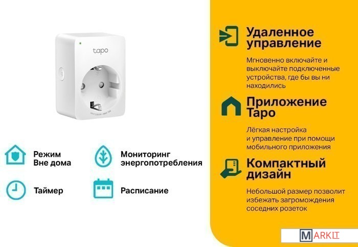 Отслеживайте энергопотребление прямо с телефонаИспользуйте мобильное приложение Tapo, чтобы мгновенно включать или выключать подключённые устройства — где бы вы ни находились. Сделайте свою жизнь проще и безопаснее.Отслеживайте энергопотребление в реальном времени через приложение Tapo. Экономьте с умом, включая бытовую технику во время действия дешёвых тарифов на электроэнергию.Создавайте расписания работы и таймеры на всю неделю. Все подключённые устройства будут автоматически активироваться и отключаться в заданное время, делая жизнь удобнее и энергоэффективнее.Объедините несколько устройств в одну группу, чтобы их можно было вместе включать или выключать одним нажатием.Благодаря небольшому размеру Tapo P110 не загромождает соседние розетки.Нет интернета? Нет электричества? Не переживайте — всё продолжит работать как надо.После восстановления питания розетка Tapo вернётся к одному из состояний.Вы можете делиться правами доступа и управления с членами семьи, экономя время и упрощая использование устройства — особенно для людей в возрасте.Функция «Нет дома» создаёт видимость того, что дома кто-то есть, периодически включая и выключая подключённое устройство (например, лампу).Огнестойкий материал UL94-V0.Защитные шторки уберегут детей.Долгий срок службы и стабильное подключение благодаря нержавеющей стали.Контроль качества CE.Размеры (В × Ш × Д) 51 × 72 × 40 ммМатериал ПоликарбонатМаксимальная нагрузка 3680 Вт, 16 А