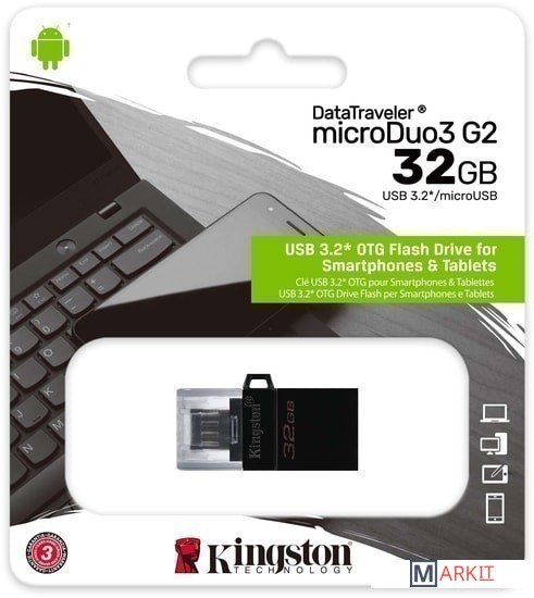 Флеш-накопители DataTraveler microDuo от компании Kingston имеют компактный форм-фактор и предоставляют дополнительную память для планшетов и смартфонов, поддерживающих функцию USB OTG (On-The-Go). Стандарт USB OTG позволяет напрямую подключать мобильные устройства к поддерживаемым USB-устройствам.Флеш-накопители DataTraveler microDuo емкостью до 128ГБ позволяют использовать разъемы microUSB, часто применяемые для зарядки устройств, в качестве портов расширения памяти. DTDUO3G2 идеально подходит для хранения больших файлов в путешествиях, обеспечивая функцию plug-and-play в планшетах и смартфонах Android без разъемов microSD; при этом цена на гигабайт у накопителя ниже, чем у дополнительных встроенных накопителей для мобильных устройств.