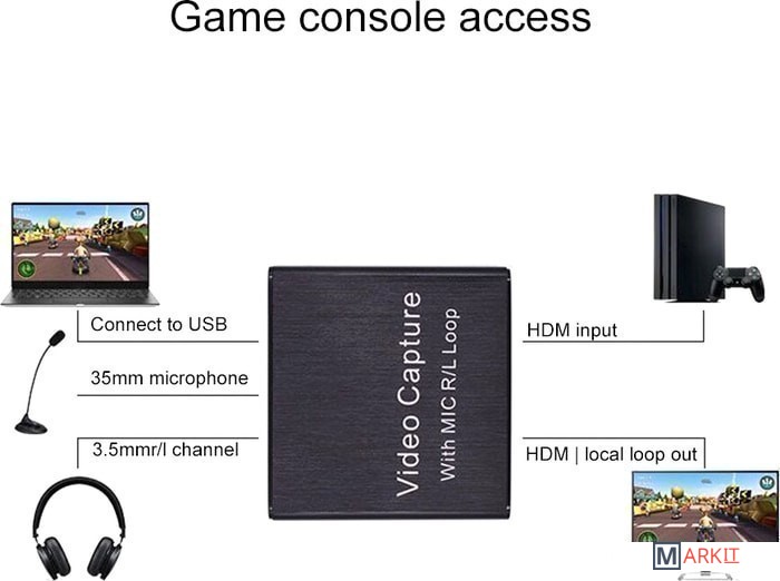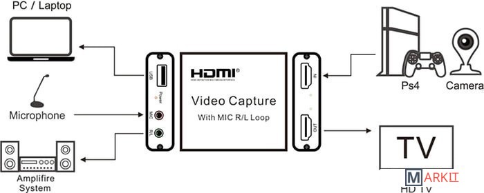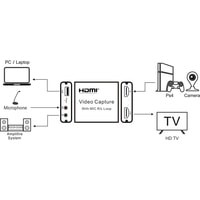 Устройство видеозахвата предназначено для захвата, записи и передачи видео и аудио HDMI на ноутбук, ПК, смартфон и т.п. Имеет стерео выход AUX jack 3,5mm и вход для микрофона.Характеристики:– Поддержка максимального входного разрешения до 4К– Поддержка максимального выходного разрешения до 1080P– При использовании стандартного кабеля AWG26 входное расстояние передачи составляет до 15 метров (разрешение 1080P и ниже)– Поддержка 8/10/12 бит глубокий цвет– Поддержка большинство программ сбора данных, таких как VLC, OBS, Amcap и т. д.– Совместим с Windows, Android и MaOS– Соответствует стандартам USB Video и UVC, UAC USB Audio– Максимальный рабочий ток: 0,7 А / 5 В постоянного тока– Диапазон рабочих температур: от -10 ℃ до +55 ℃– Поддержка аудио формата L-PCM